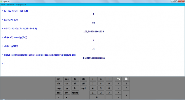 Opercalc - это удобный калькулятор, с поддержкой наиболее часто используемых математических функций, операций и скобок.