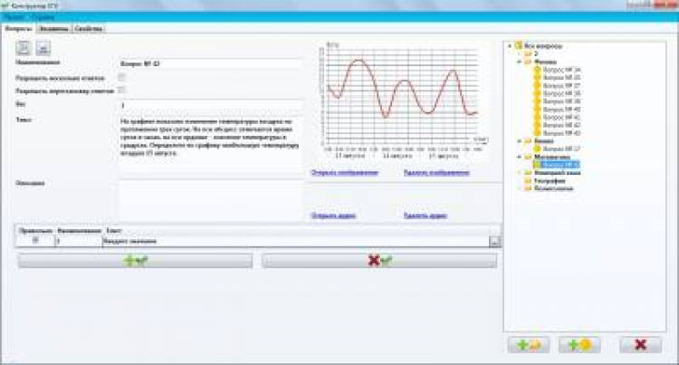 - Возможность добавления графической и аудио-информации к вопросам и вариантам ответов;
