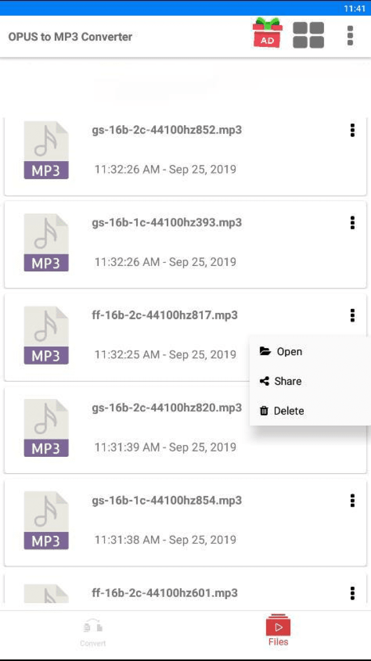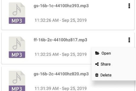 Стоит отметить, что приложение сохраняет список всех преобразованных файлов на специальной вкладок. Отсюда можно мгновенно открыть нужную аудиозапись, удалить её, либо отправить друзьям через социальные сети, мессенджеры или другим удобным способом. Сохраненные mp3-файлы хранятся во внутренней памяти смартфона, в папке "Opus-To-Mp3-Converter".