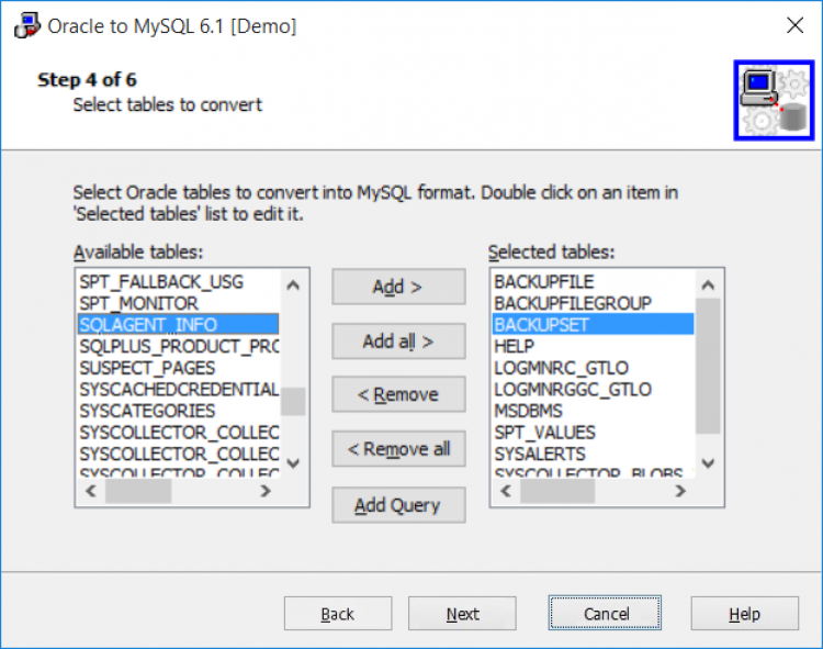 - Демо-версия не конвертирует представления и отношения связности между таблицами