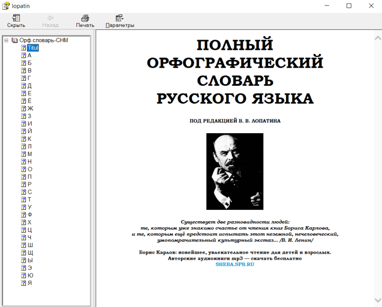 Орфографический словарь русского языка - это электронный словарь под редакцией Лопатина. Скомпиллирован в файл справки, не требует инсталляции. Узнавайте правильное написание слов, быстро и без установки каких-то специфических сторонних приложений. Прост в обращении, содержит всевозможные определения, включая относительно новые слов.