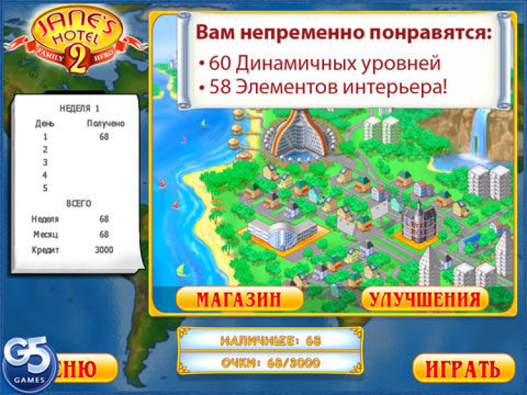После того, как Джейн построила свою гостиничную сеть, она готова вернуть былую популярность отелям, принадлежавшим её семье. Изучите современные тенденции в мире отельного бизнеса, чтобы ваши гостиницы во Франции, Англии, Японии и на Канарах процветали! В этой игре у ваших посетителей будет еще больше поводов полюбить ваши отели – превосходные апгрейды, трудолюбивые помощники: смышленая горничная и расторопный портье приложат все усилия, чтобы оказать теплый прием вашим постояльцам. Ваши посетители заслуживают первоклассный сервис!