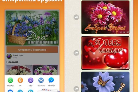 Огромный выбор как ежедневных открыток (доброе утро, спокойной ночи и пр.), так и приуроченных к какому-либо событию. Для удобства выбор все открытки разделены на категории и по праздникам. Все в приложении есть более 20 категорий и более 17 000 открыток. Так что теперь вы сможете очень быстро найти и отправить подходящую открытку, чтобы порадовать друзей и родственников. Все открытки доступны бесплатно и без ограничений. А приложение целиком и полностью на русском языке.