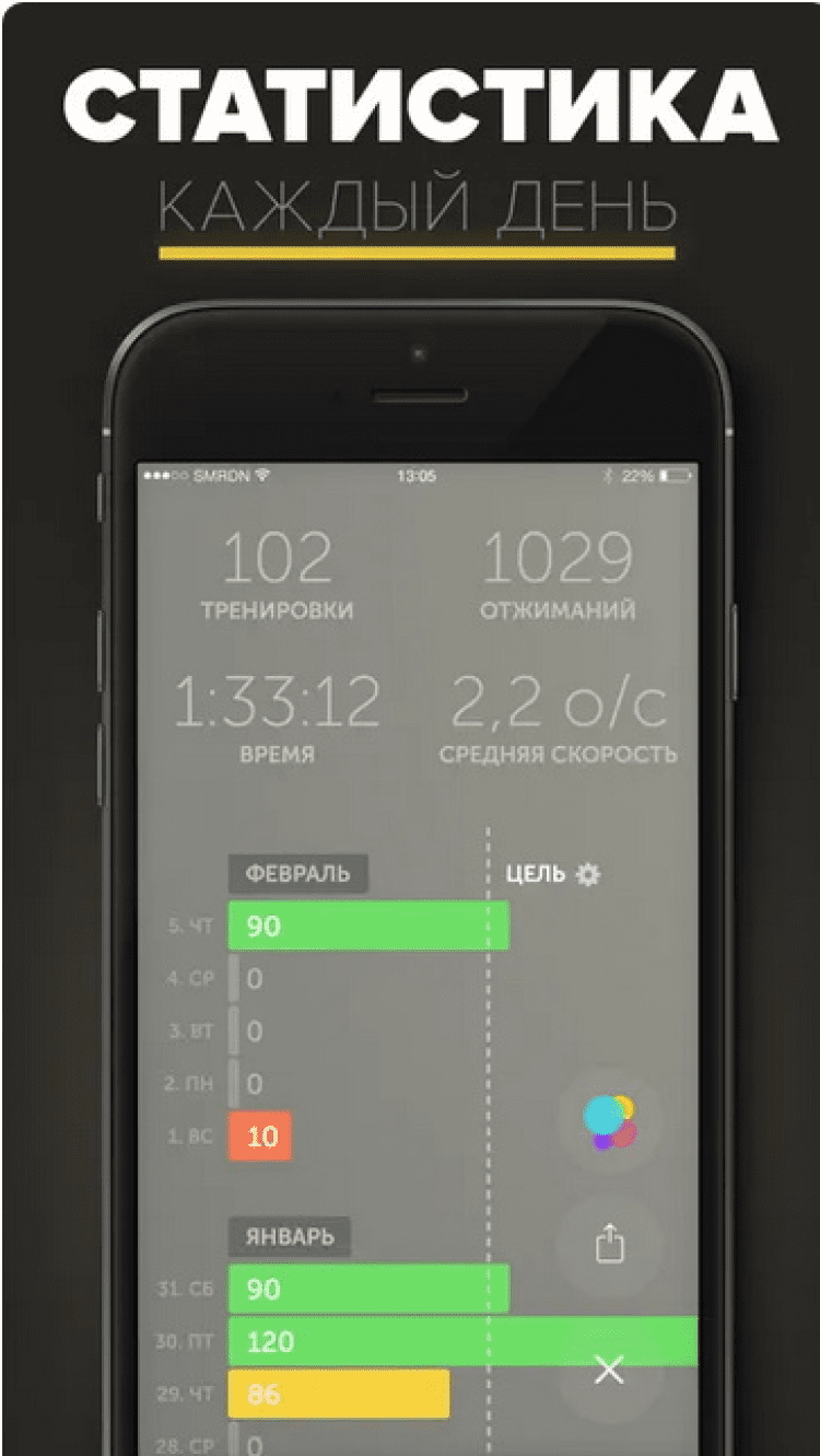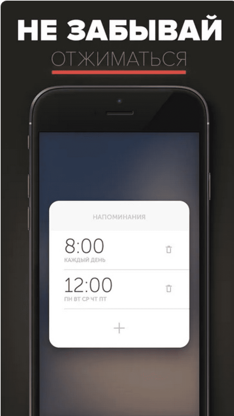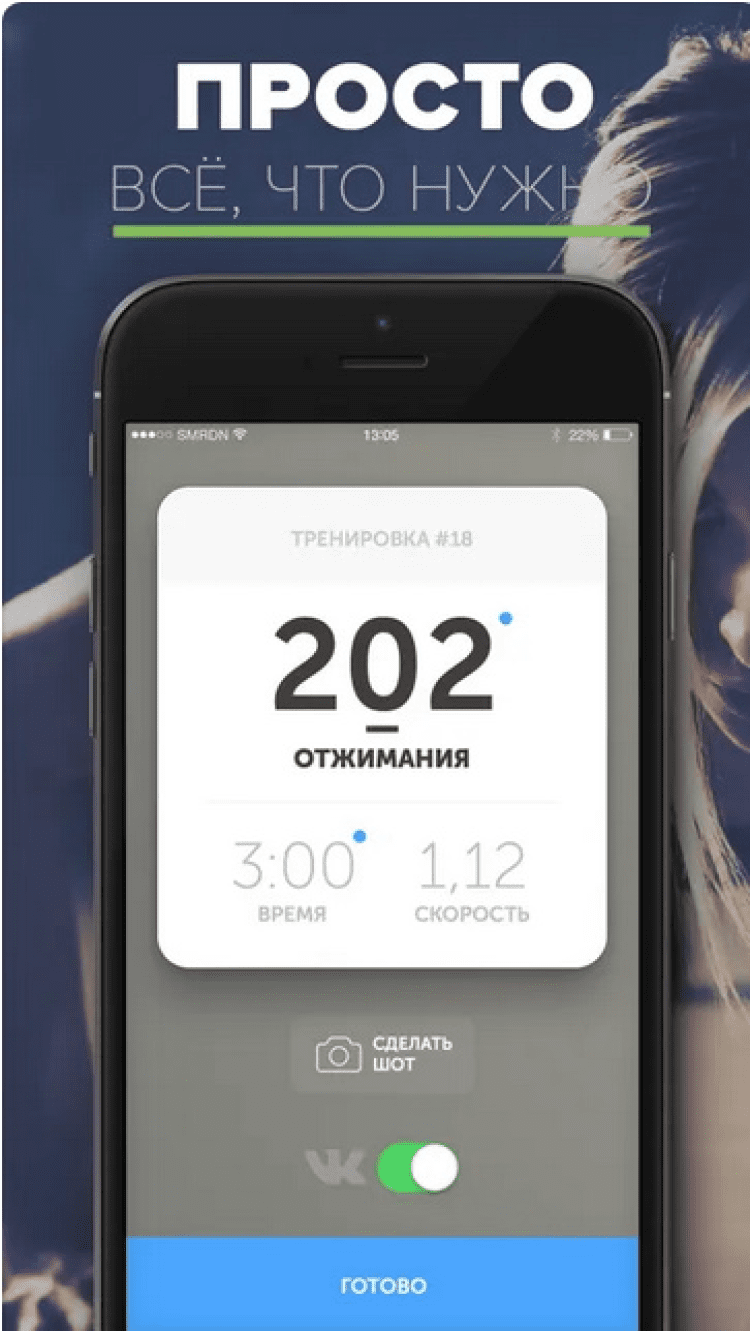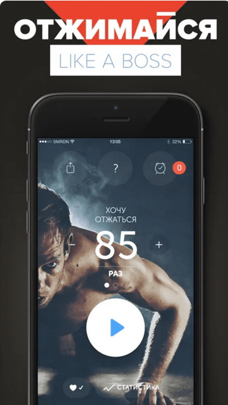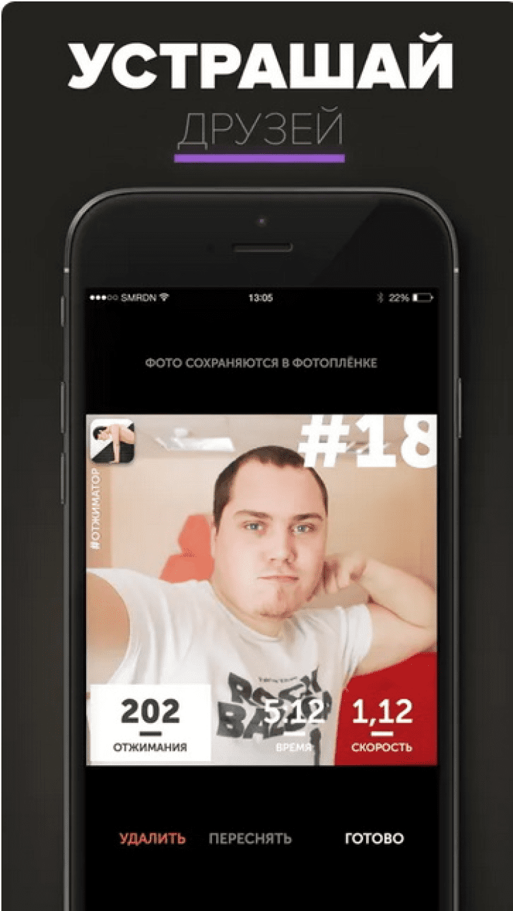 Отжиматор Приложение для тех, кто не может себя заставить заняться спортом и поддерживать физическую форму. Приложение со смешным названием "Отжиматор" не только поможет вам посчитать количество правильных отжиманий, сделанных Вами, но и будет напоминать согласно расписанию о необходимости отжаться, покажет графики ваших тренировок, позволит поделиться вашими достижениями с друзьями в facebook и twitter, и даст возможность побороться за награды.