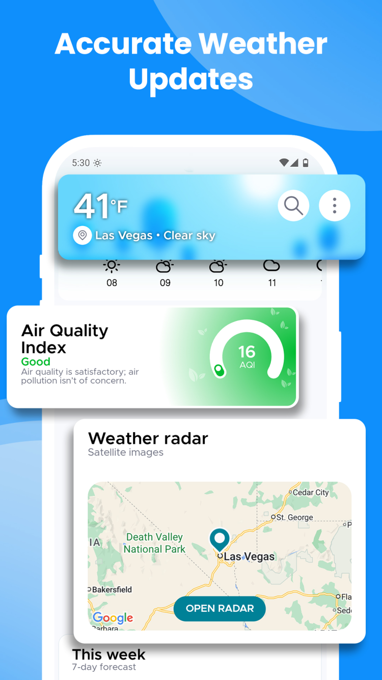 Еще одним важным преимуществом приложения Overdrop является его понятное и приятное отображение информации. На главном экране приложения вы можете увидеть несколько информационных панелей. На одной из них отображается подробная информация о текущей погоде за окном, на другой — почасовой прогноз с графиком, который поможет вам скорректировать свои планы. Здесь же вы можете увидеть ключевую информацию о погоде на предстоящую неделю и даже посмотреть на метеорологический радар с изоражениями со спутника.