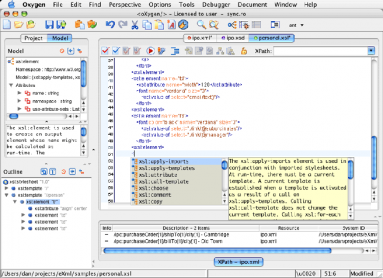 oXygen - это приложение для редактирования данных XML. oXygen обладает развитыми возможностями по преобразованию форматов, которые позволяют редактировать документы XSLT и XSL-FO и сохранять документы в любом формате (HTML, PS или PDF) одним нажатием кнопки. Программное обеспечение также допускает применение трансформаций XSLT 1.0, XSLT 2.0 и XQuery к файлам, размещенным внутри ZIP-архива, и позволяет пользователям заниматься сравнением и слиянием архивированных файлов. Кроме того, программа обеспечивает доступ ко множеству XML и относящихся к ним базам данных, включая MarkLogic, Oracle, Tamino, IBM DB2, eXist.