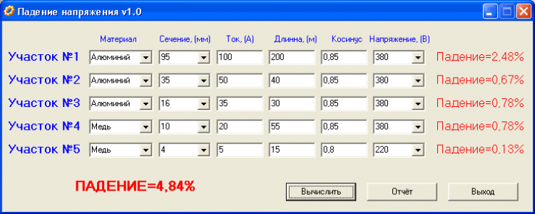Падение напряжения v1.0 Программа предназначена для расчёта падения напряжения в электрических сетях переменного тока напряжением 220/380 В и частотой 50 Гц.