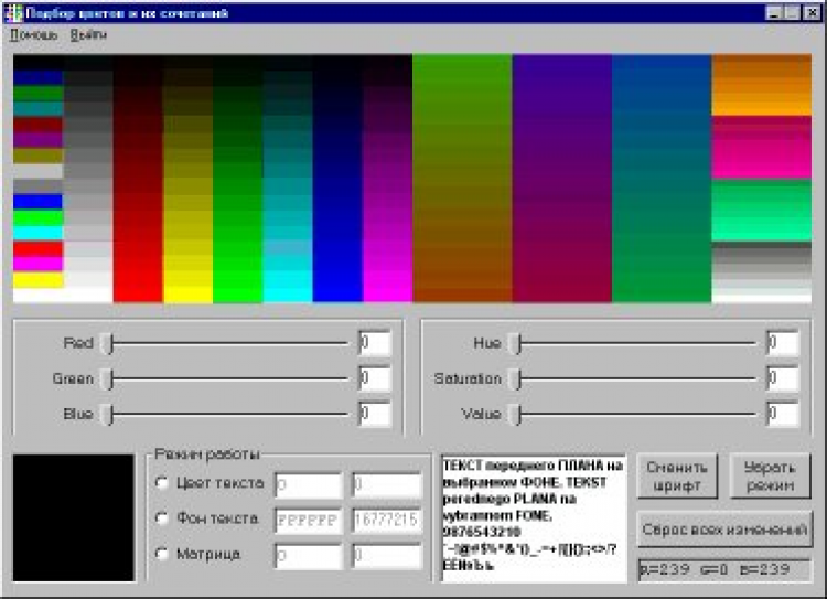 Содержит встроенную русификацию и поддерживает мышь. Модули под Win32 и Win16 аналогично выводят на экран палитру, но имеют некоторые дополнительные возможности (формат HSV, подбор сочетаемости цветов текста и т.д.). Внимание! Модули распространяются отдельно. На сайте автора можно скачать исходные тексты всех вариантов программы.