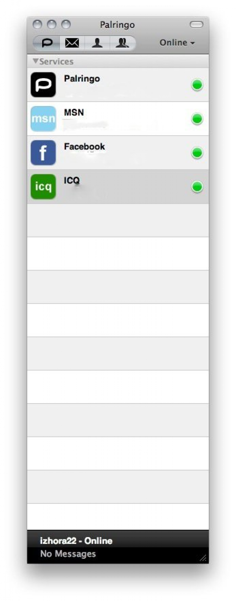 Palringo Мультипротокольный мессенджер для Mac OS X. Palringo поддерживает ICQ, MSN, Facebook, Jabber. Умеет передавать медиаконтент, фото, аудио, видео. Программа обладает необходимым минимумом настроек и довольно проста в использовании. Поскольку весь трафик идет через сервера Palringo, то при первом запуске необходимо зарегистрироваться.