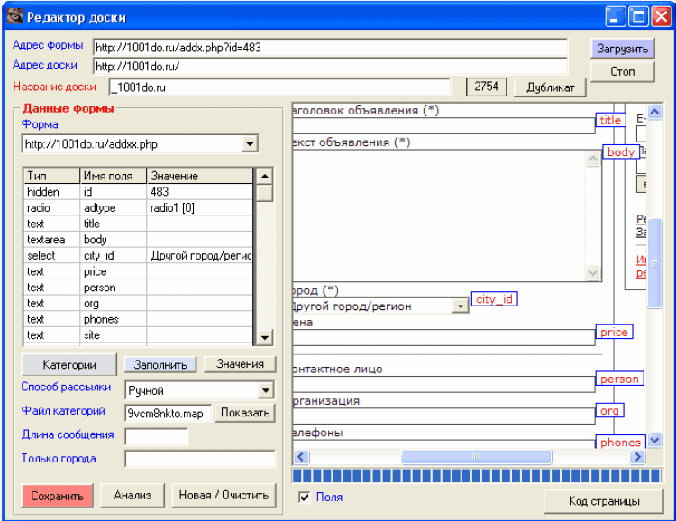 Программа размещает сообщения на досках объявлений в интернет по выбранным разделам.