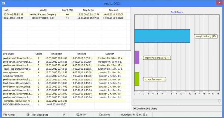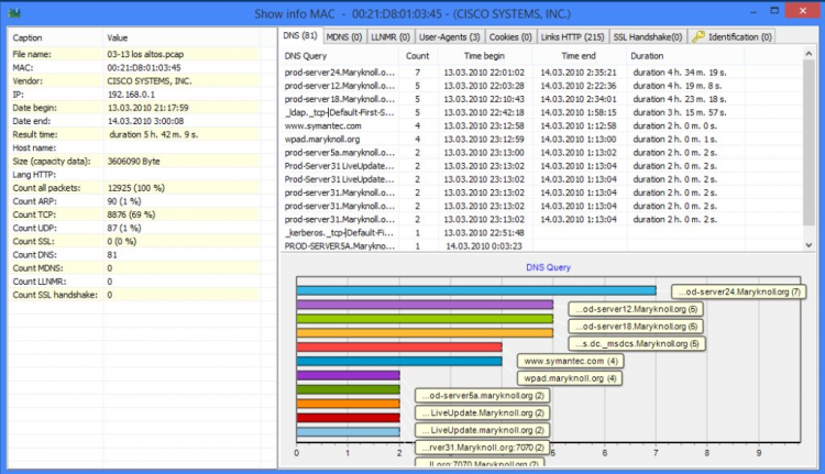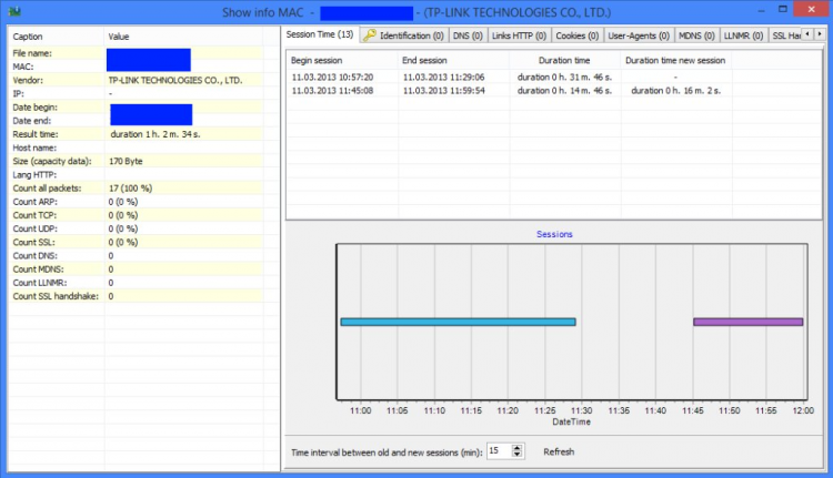 - Детальный просмотр выбранного МАС адреса из загруженного файла (отображение COOKIES, USER-AGENTS, сетевое название выбранного хоста и т.д.)