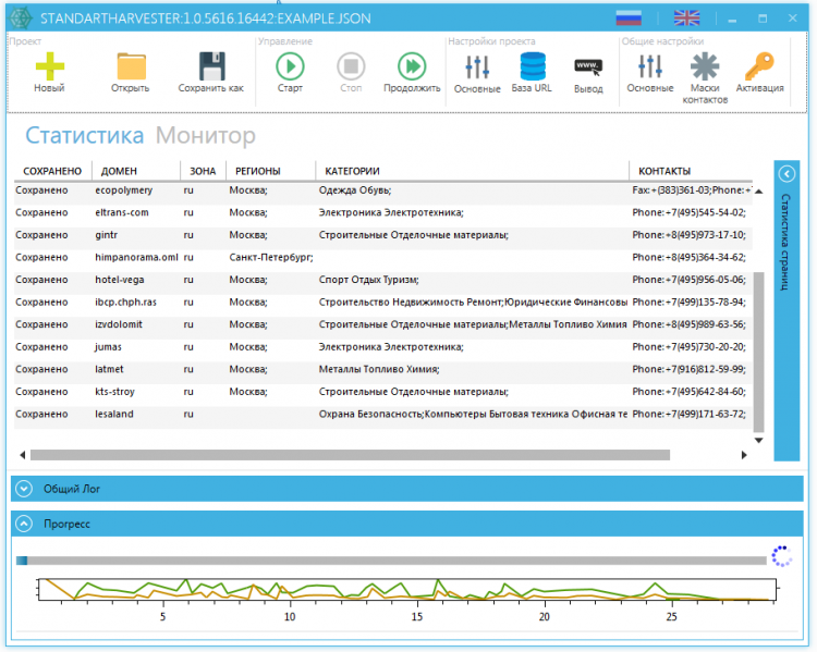Парсер StandartHarvester осуществляет поиск информации на сайтах, результатом поиска становятся любые контакты, определение местонахождения компании, а также сферу деятельности компании. Полученные результаты будут сохранены в таблице Excel (.csv файл). Программа поможет Вам собрать интересующую информацию о предприятиях, а удобный формат сохраненного файла не потребует длительного вникания в процесс работы с полученной информацией.