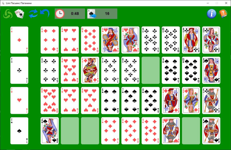 Пасьянс Паганини не только развивает мышление и внимательность, но и поможет расслабиться в перерыв на работе, и провести время с пользой.