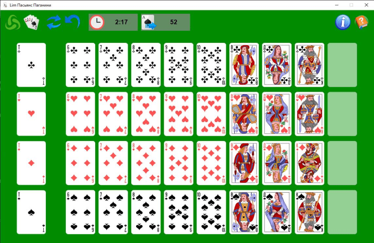 Пасьянс Паганини, в котором необходимо собрать карты одной масти в линию в восходящих последовательностях. После раскладки тузы перемещаются в левую сторону поля и от них уже начинается раскладка пасьянса. Карты можно перемещать на свободные поля по определенным правилам. Справа от туза кладется шестерка той-же масти что и туз, в другие же места можно положить карту если справа он нее располагается карта той-же масти но выше по старшинству или слева карта той-же масти, но на одну позицию ниже по старшинству. Пасьянс считается сложенным если по всех линиях располагаются карты одной масти в последовательности (Туз, 6, 7, 8, 9, 10, Валет, Дама, Король).