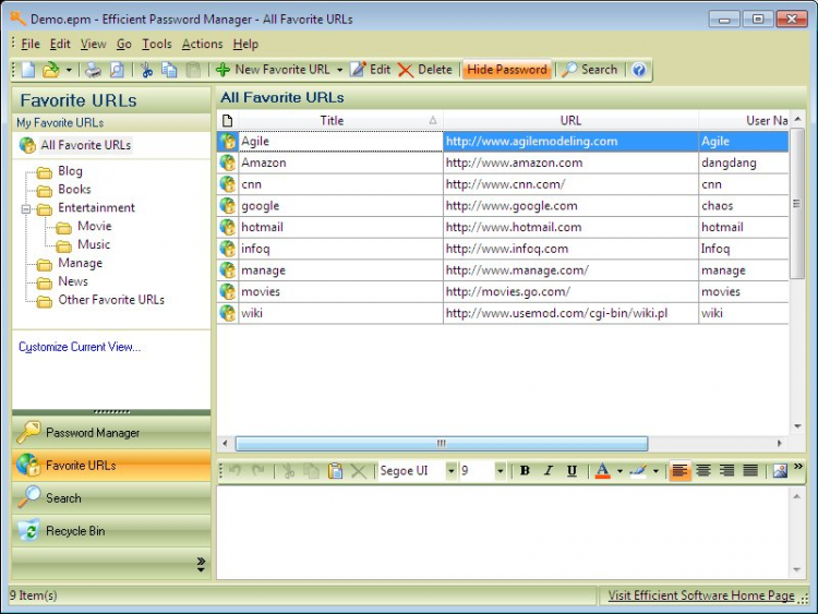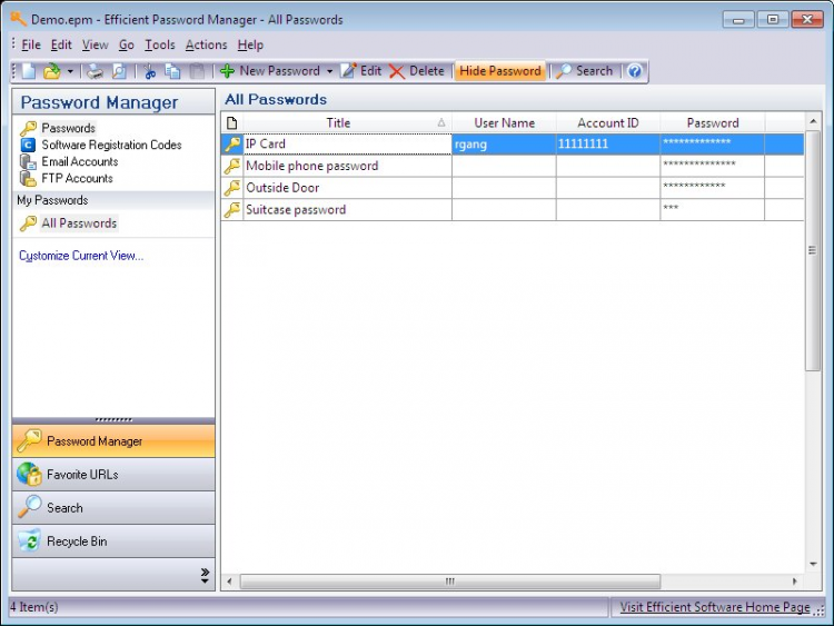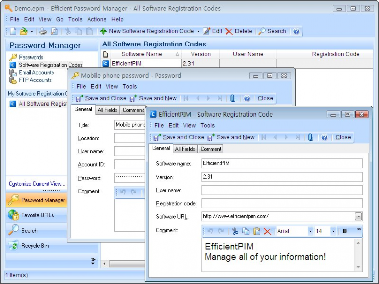 Password Manager - это программа, которая позволяет генерировать устойчивые к подбору пароли и защищенно хранить их на вашем компьютере. Вам необходимо помнить только пароль доступа к программе, а она запомнит все остальные. Также программа позволяет хранить серийные (регистрационные) коды от ваших программ. Файлы, в которых хранятся пароли, зашифрованы с помощью стойкого алгоритма AES длиной 256-бит, что делает невозможным расшифровку файлов без главного пароля.