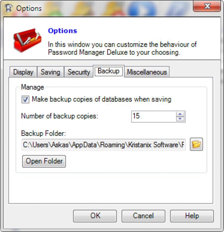 Справа Password Manager Deluxe показывает все сохраненные записи в выбранной категории. В этом списке можно увидеть название записи, логин, адрес веб-сайта и прочую информацию. К записи можно добавлять описание, а также прикреплять файлы. Программа позволяет копировать логин и пароль прямо из списка, не открывая саму запись. Если в записи указан адрес веб-сайта, то его можно открыть также прямо из программы в браузере по умолчанию. В этой программе есть ряд полезных опций. Например, можно настроить автоматическую блокировку базы данных при сворачивании программы в системный трей или простое в течении определенного количества времени. Кроме этого, можно настроить резервное копирование базы при сохранении. Количество резервных копий и папку для их хранения можно задать в настройках программы.