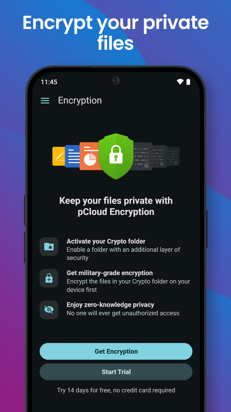 Заканчивается место на вашем смартфоне? Не проблема, ведь создано уже есть много надежных облачных сервисов, и pCloud — один из них. С этим приложением вы можете получить 10 ГБ личного хранилища бесплатно или заплатить за дополнительное пространство. Используя pCloud, вы можете безопасно хранить свои фотографии, музыку, видео, документы и любые другие данные и получать к ним доступ без лишних усилий, с любого из ваших мобильных и настольных устройств, не жертвуя скоростью или безопасностью. Кстати, все данные пользователей хранятся на защищенных серверах с шифрованием на стороне клиента благодаря pCloud Crypto, который гарантирует, что ваши данные защищены от перехвата и остаются недоступными для третьих лиц. А при обмене тяжелыми файлами, программа предлагает расширенные меры безопасности: установку пароля для доступа или доступность только в течение указанного периода.