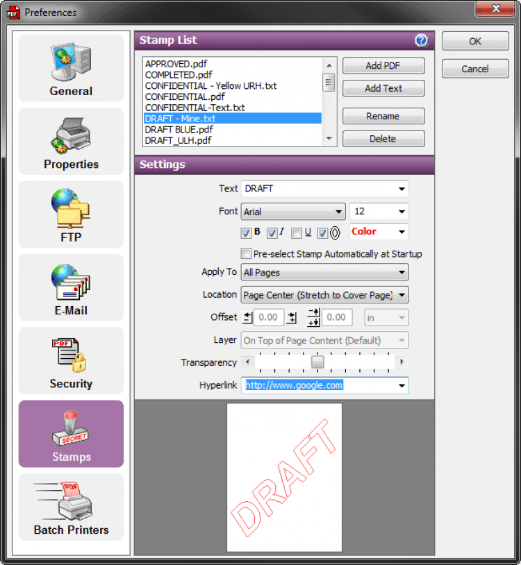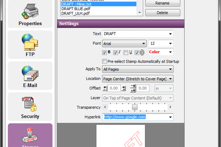 Программа PDF ReDirect добавляет соответствующий пункт в меню "Печать", что позволяет "печатать" PDF документы практически из любой программы. С помощью PDF ReDirect вы можете создавать обычные PDF документы, объединять несколько документов один файл и накладывать штампы. Параметры штампа вы можете настроить по своему желанию.