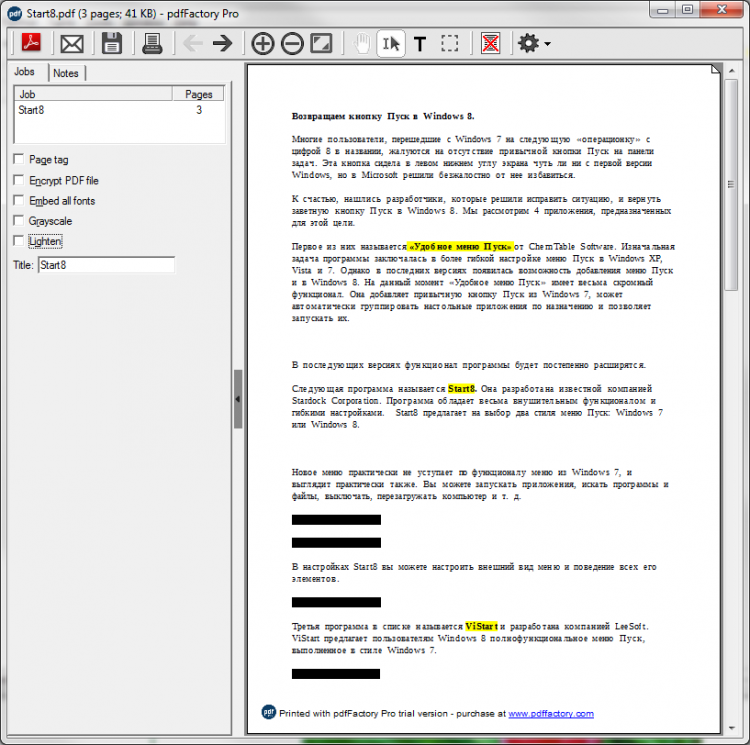 С помощью pdfFactory Pro можно быстро создавать одно- и многостраничные документы с любой нужной информацией. Программа позволяет добавлять на страницы документа нумерацию, заголовки и колонтитулы. Вы можете добавлять текстовые комментарии; выделять, редактировать и копировать текст; конвертировать текст в гиперссылки.