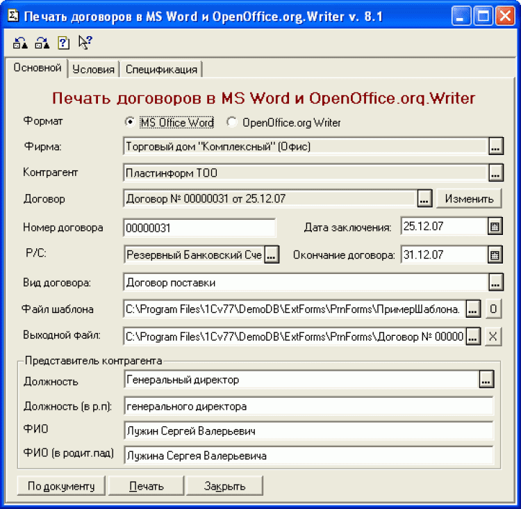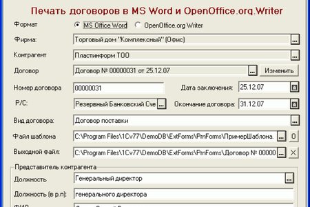 Печать договоров из среды 1С:Предприятие в формате MS Word Внешняя обработка и внешняя печатная форма для большинства типовых конфигураций (Комплексная, ТиС,ПУБ, БУ,УСН,Предприниматель).