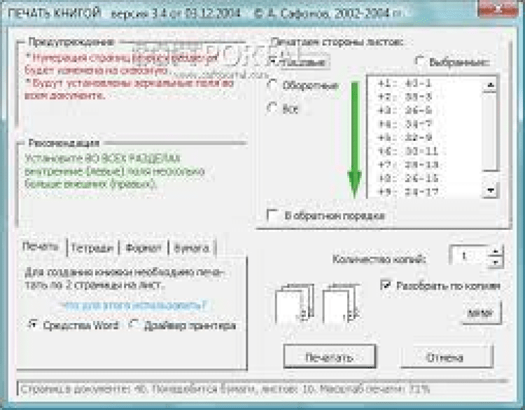Печать книгой Надстройка для MS Word версий 97-2007, печатает любые имеющиеся документы в форме брошюры или книги, состоящей из нескольких книжных тетрадей. Печатает исходный документ как есть (без предварительной верстки). Страницы документа печатаются в уменьшенном или увеличенном виде (в зависимости от размера бумаги) без изменения их формата. Программа протестирована в Тестовой лаборатории PC Magazine/RE в рамках конкурса Microsoft Office Extensions, рекомендована к использованию экспертами журнала PC Magazine / RE.
