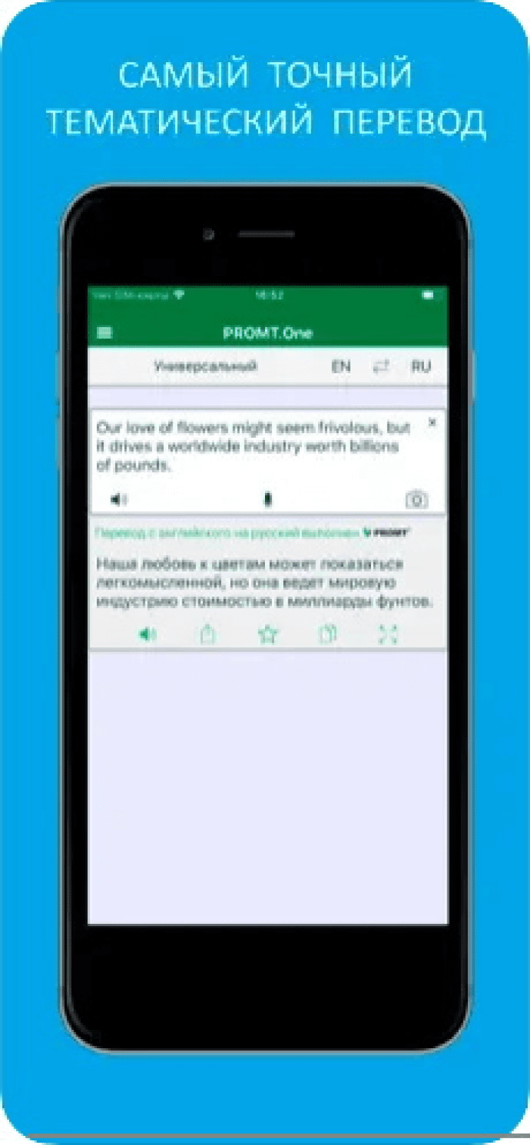 Переводчик PROMT.One обеспечивает полный и качественный перевод, благодаря использованию передовой технологии PROMT. Приложение настроено на самые популярные темы для перевода, такие как изучение языков, наука и образование, техника, переписка в социальных сетях, бизнес, спорт, путешествие, покупки и здоровье.