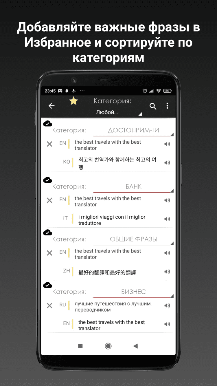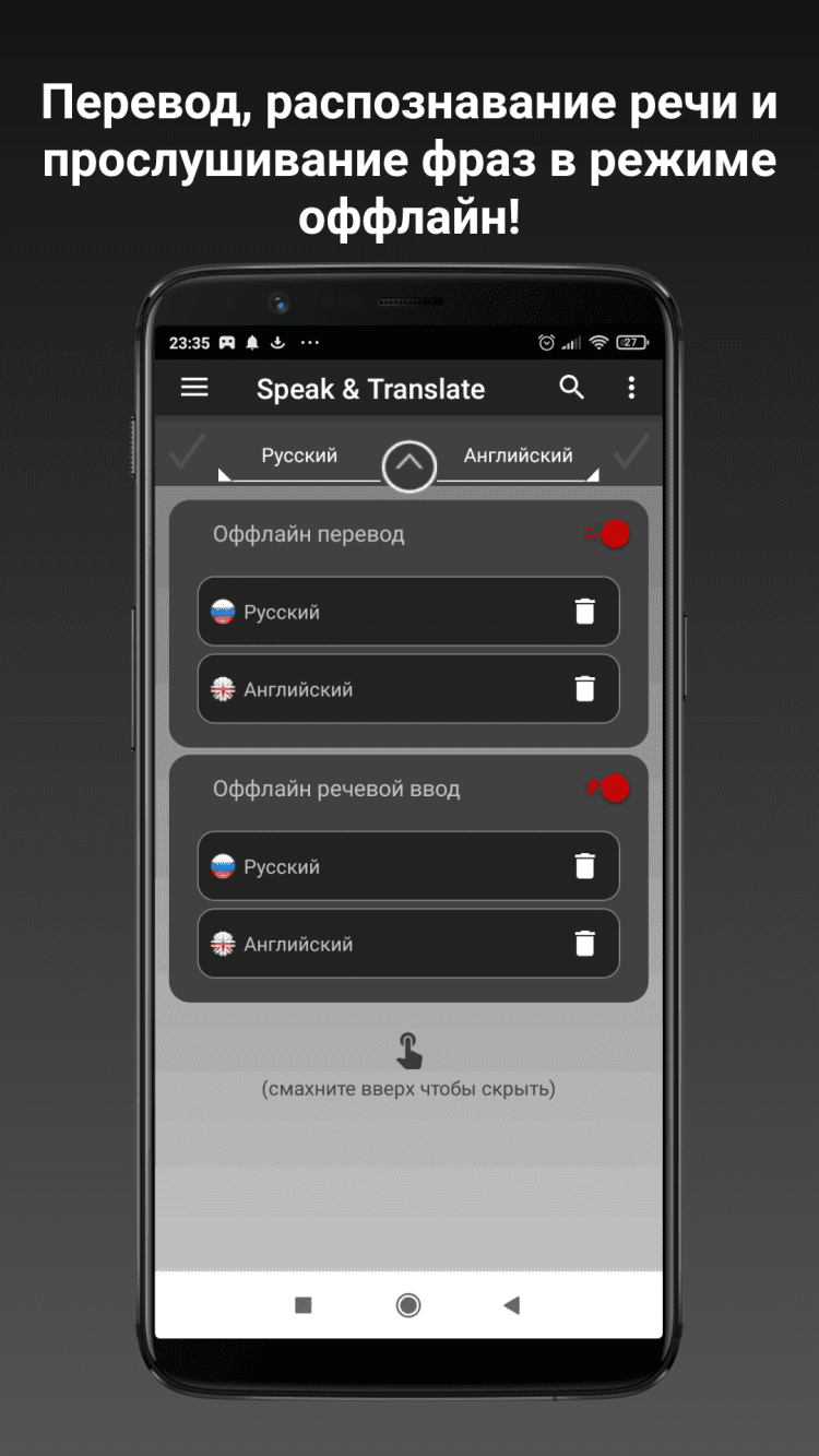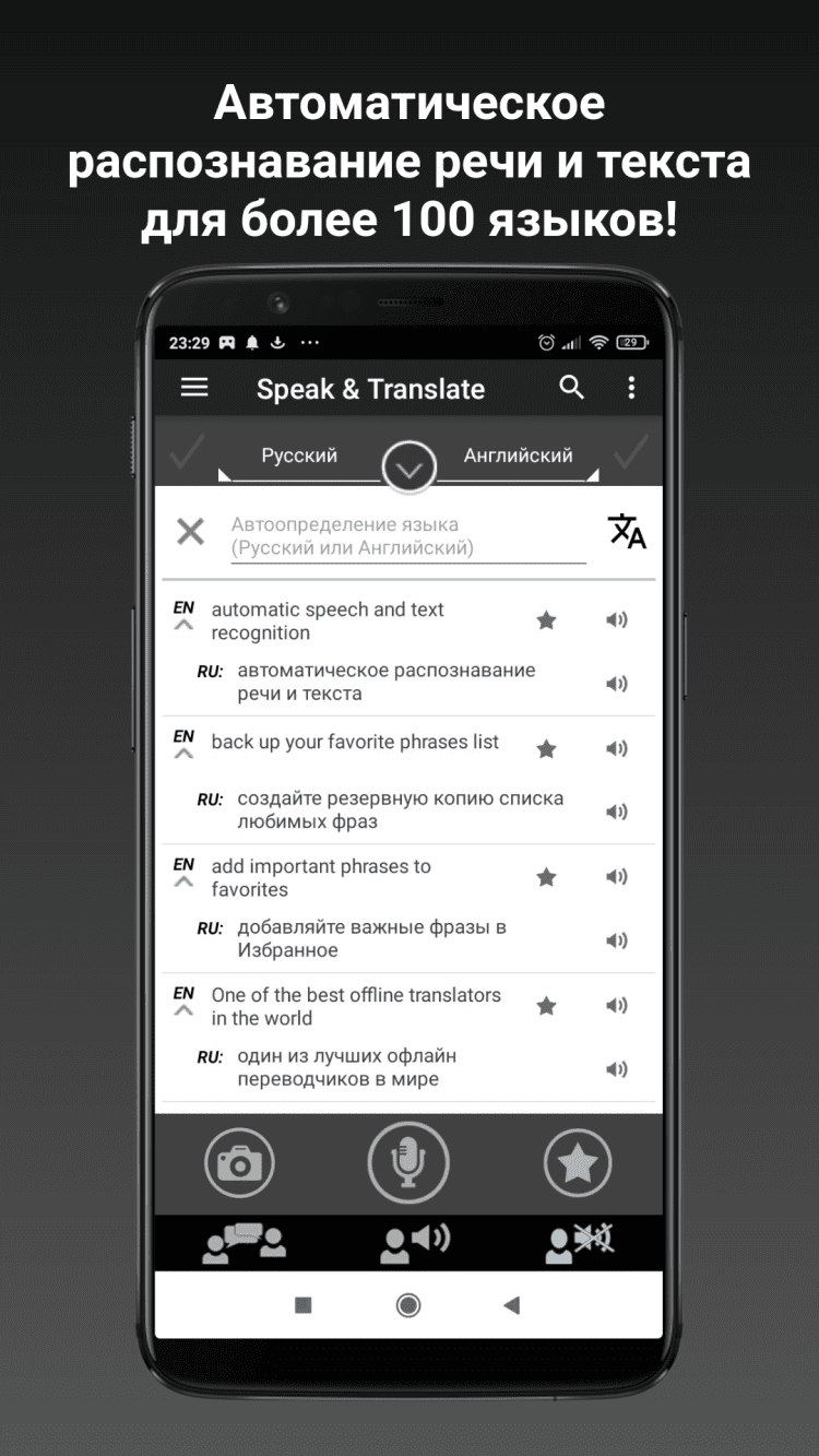 Переводчик Speak & Translate Удобный переводчик для Android, который поможет вам получить перевод желаемых фраз как в текстовом виде, так и озвучить их, для изучения правильного варианта произношения. Приятной особенностью программы является возможность сохранить любые фразы в список избранного, чтобы получить к ним доступ в будущем, в режиме оффлайн.