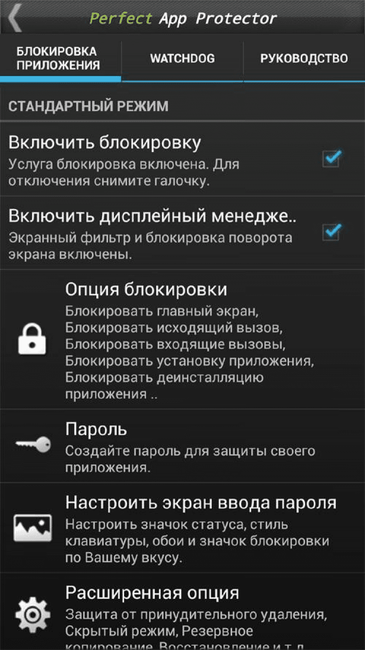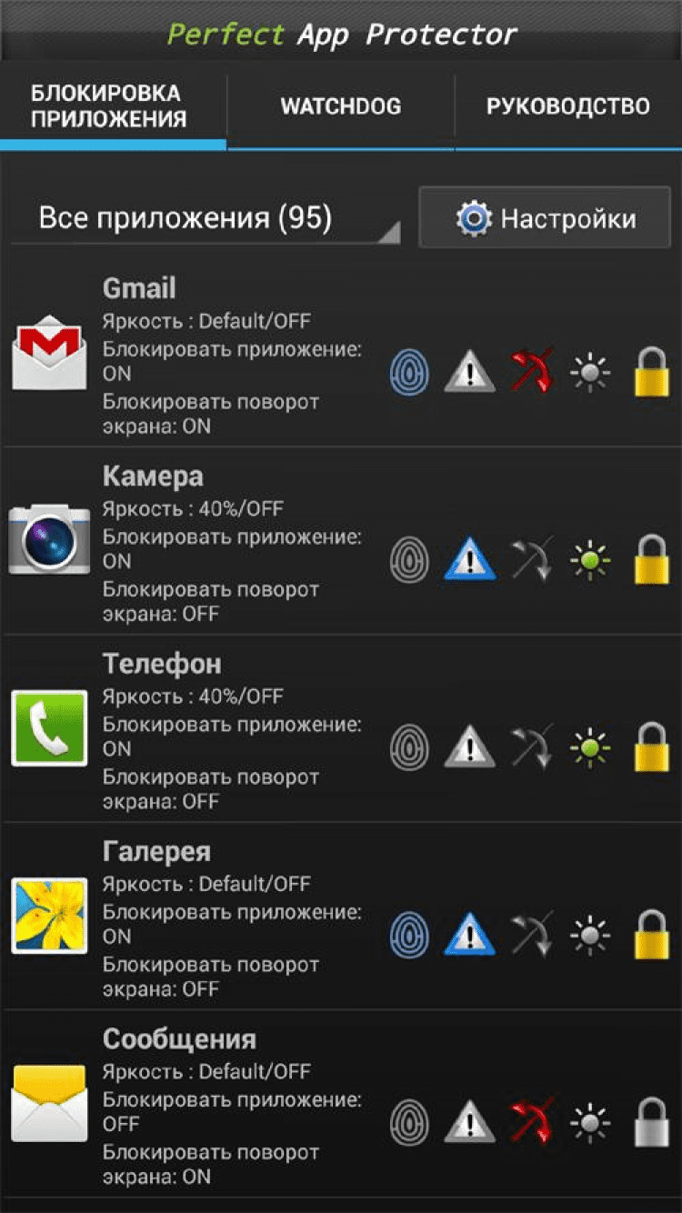 Perfect App Lock (русский) Эта программа поможет вам защитить доступ к любым приложениям на вашем мобильном устройстве при помощи пароля или комбинации. Помимо этого, благодаря Perfect App Lock вы сможете управлять яркостью экрана для отдельных приложений, блокировать поворот экрана, блокировать подключение к компьютеру по USB, а так же активировать функционал приложения при помощи SMS.
