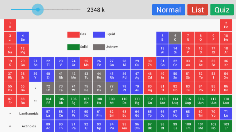 Periodic Table Периодическая таблица химических элементов на экране вашего мобильного устройства. Программа позволит вам выполнять поиск элемента по его названию, а так же просматривать информацию о каждом из них. Программа оптимизирована для планшетов.