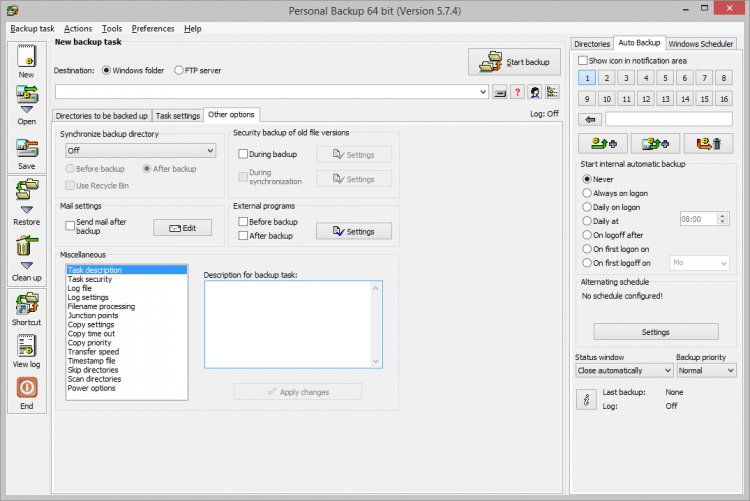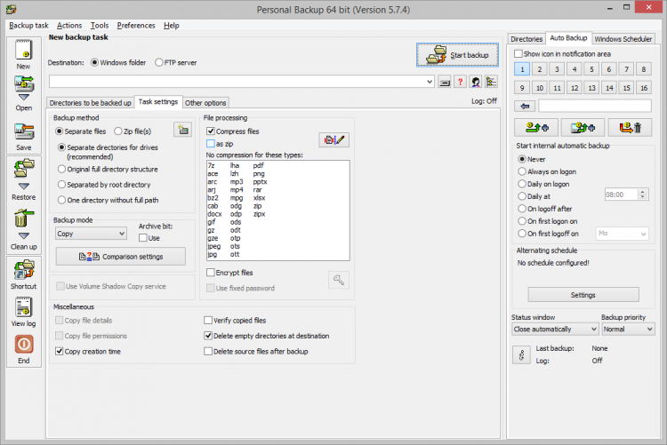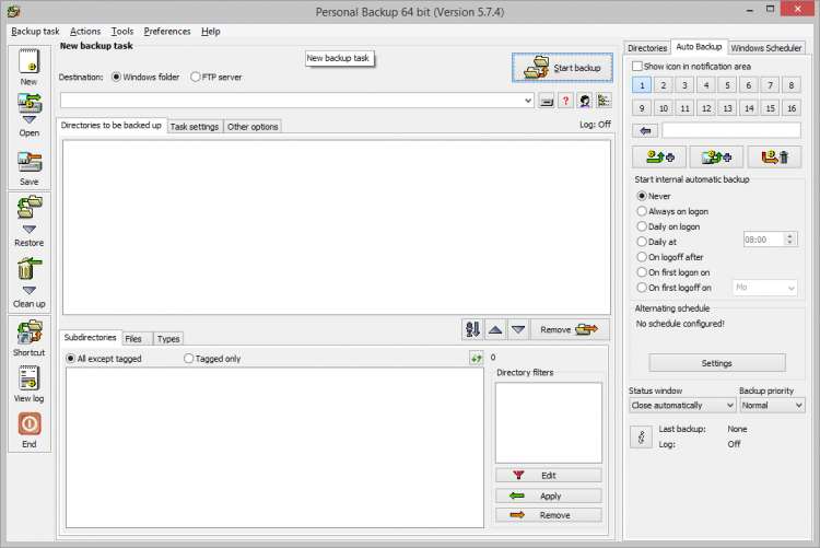 Personal Backup позволяет создавать неограниченное количество задач для создания резервных копий. При создании бэкапа программа полностью сохраняет оригинальную структуру файлов и папок, и может сохранять резервные копии на локальном или сетевом компьютере, и на FTP-сервере. С помощью гибких фильтров можно исключать конкретные типы файлов и папки из копирования.