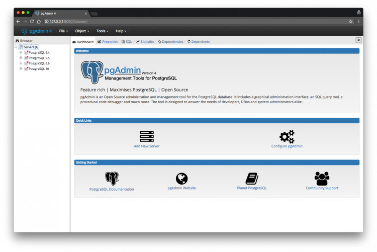 pgAdmin 4 Кроссплатформенная программа для работы с серверами PostgreSQL, которая позволяет запускать SQL-скрипты, просматривать заявления и процедуры, а также управлять сразу несколькими базами данных.