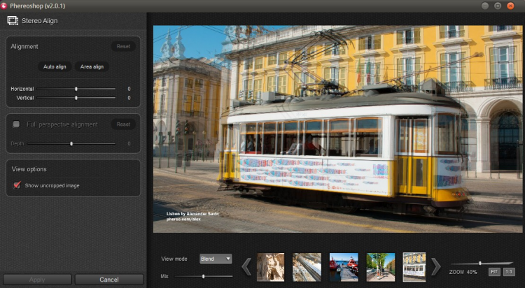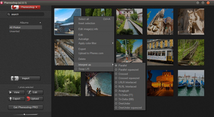 Phereoshop - это программа, которая является уникальным приложением для работы со стереоизображениями, разработанный специально для фотографов. С помощью приложения можно создавать коллекции из изображений, размещая их по альбомам с возможностью загрузки их на сайт Phereo.com для дальнейшего обмена своими изображениям. В приложение встроен мощный неразрушаемый редактор стереозображений, включающий такие инструменты, как "обрезка", "цветокоррекция", "смещение изображения стереопары" (stereo align), "поменять левое и правое изображение" (swap), и др.