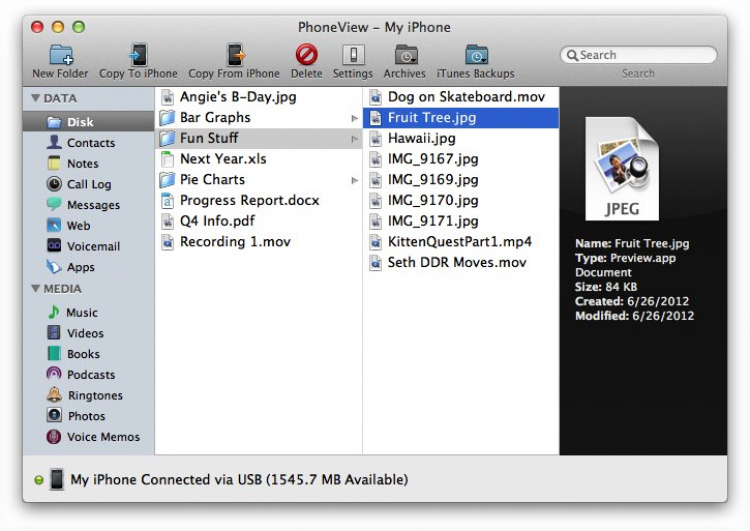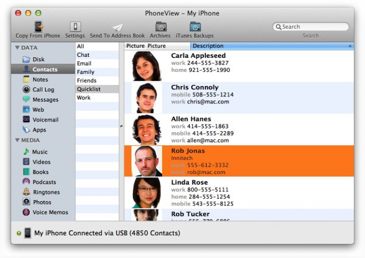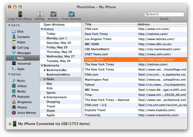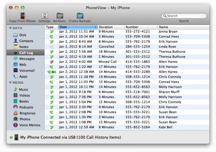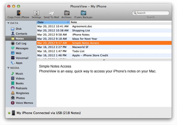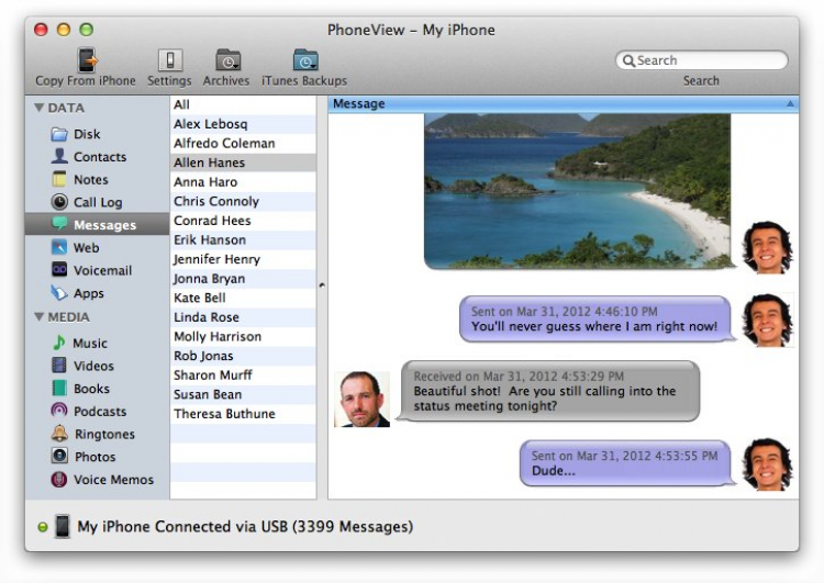 PhoneView Программа для управления контентом на iPhone. Эта простая в использовании и не требовательная к ресурсам утилита поможет получить доступ к голосовым сообщениям, SMS/MMS, журналу звонков, приложениям, заметкам, контактам, медиа-контенту и, конечно же, файлам хранящимся в памяти телефона. С помощью PhoneView моожно использовать iPhone в качестве съемного носителя. Так же с ее помощью можно не только прочитать историю сообщений, но и сохранить их в pdf, txt, rtf или csv файлы.