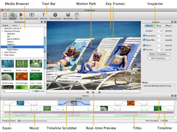 Photo to Movie позволит взглянуть на старые фотографии по новому. Вы сможете зумировать фото, делать панорамы, вращать их, и настраивать эффекты перехода от одной фотографии к другой. Добавив заголовки и наложив фоновую музыку вы можете записать получившееся слайд-шоу на DVD-диск и устроить семейный просмотр. Или показать его друзьям.