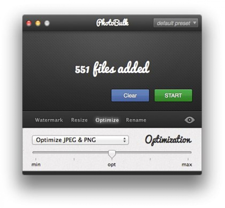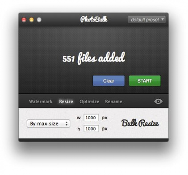 PhotoBulk PhotoBulk это многофункциональная утилита с компактным интерфейсом для обработки изображений в пакетном режиме. Позволяет применять последовательность действий к группе изображений. PhotoBulk позволяет накладывать графические и текстовые водяные знаки, временные штампы, изменять размер изображений, оптимизировать качество JPEG и PNG изображений. С ее помощью можно конвертировать изображения в форматы JPEG, PNG, GIF, BMP и TIFF. Есть функция пакетного переименования изображений. Любую последовательность этих действий PhotoBulk позволяет сохранять в пресет, и использовать их повторно.