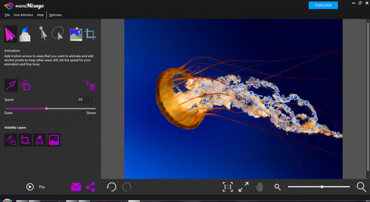 Для достижения эффекта движения PhotoMirage использует опорные точки, которые необходимо расставить в выбранной области. В принципе после этого можно сразу оценить результат, нажав кнопку "Play".