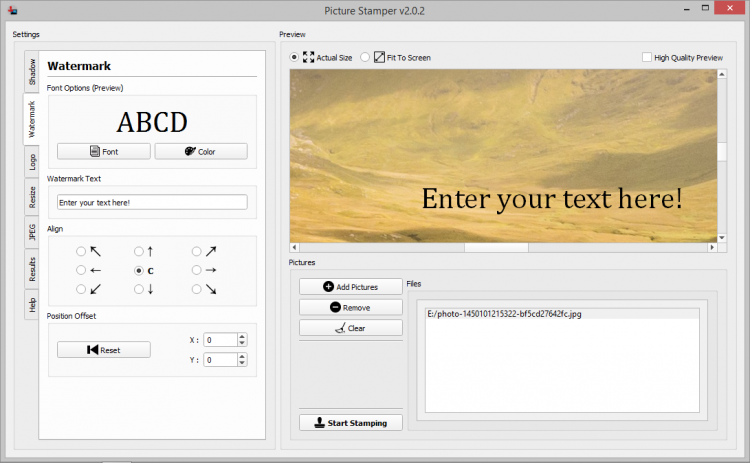 Picture Stamper позволяет накладывать на изображения текстовые водяные знаки, которые могут содержать различную информацию о владельце (имя, email и пр.), или графические (лого). Для текста можно выбрать шрифт, размер и стиль, а в качестве графического штампа можно использовать практически любое изображение.