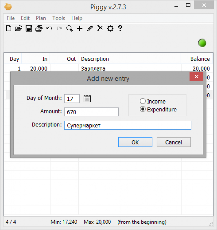 Главное отличие от других программа для ведения учета личного бюджета, Piggy крайне проста в использовании и предоставляет минимальный набор возможностей.
