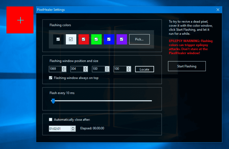 Утилита имеет очень простой интерфейс. Размер и положение ремонтной области можно изменять мышкой или координатами. Так же можно выбрать частоту мигания и набор цветов. Сама утилита доступна в виде архива с портативной версией, которую не нужно устанавливать.