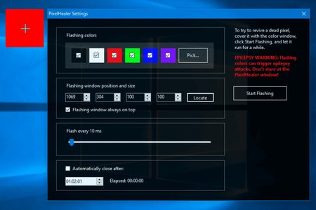 Запустите PixelHealer, наведите "ремонтную область" в нужное место и запустите мигание. Работающую утилиту рекомендуется оставить на несколько минут. Для этого предусмотрен таймер, который закроет программу по истечении отведенного времени. Если битый пиксель не исчез после первогго раза, повторите процедуру снова.