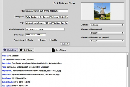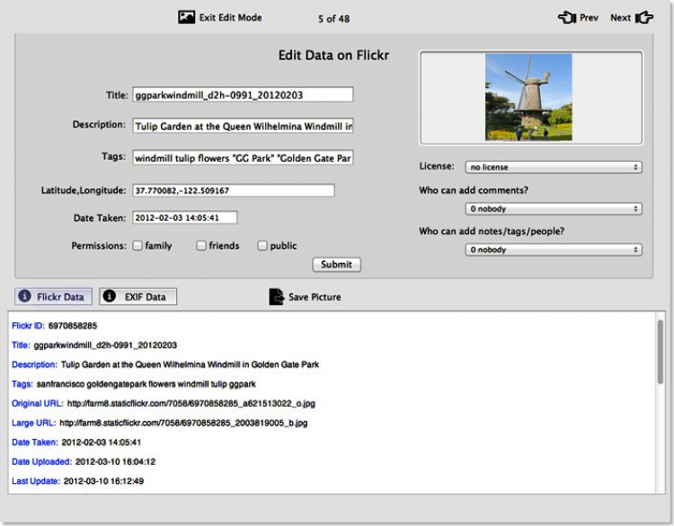 - Редактирование метаданных с Flickr (тэги, подписи, и тп.);