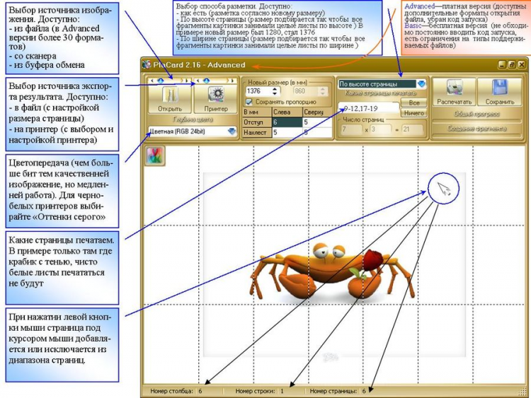 PlaCard - это программа для создания плакатов, стендов, оформления стенок. ЛЮБОЙ РИСУНОК распечатывается на любом принтере так что при склеивании фрагментов получался плакат ЗАДАННОГО РАЗМЕРА. Особенностью является возможность распечатать рисунок 4*4 точки на плакат размером 10*10 метров при этом не потерятеся плавность цвета; ПРИБЛИЗИТЕЛЬНЫЙ ПОДБОР РАЗМЕРА для экономии бумаги. Вы также можете исключить из печати некоторые страницы.