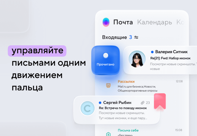 Помимо этого, Почта Mail.Ru позволяет быстрые действия с письмами, даже не открывая их. Чтобы открыть список действий, просто проведите по письму справа налево. Таким образом, письмо можно быстро пометить прочитанным, флагом, либо переместить или удалить его.