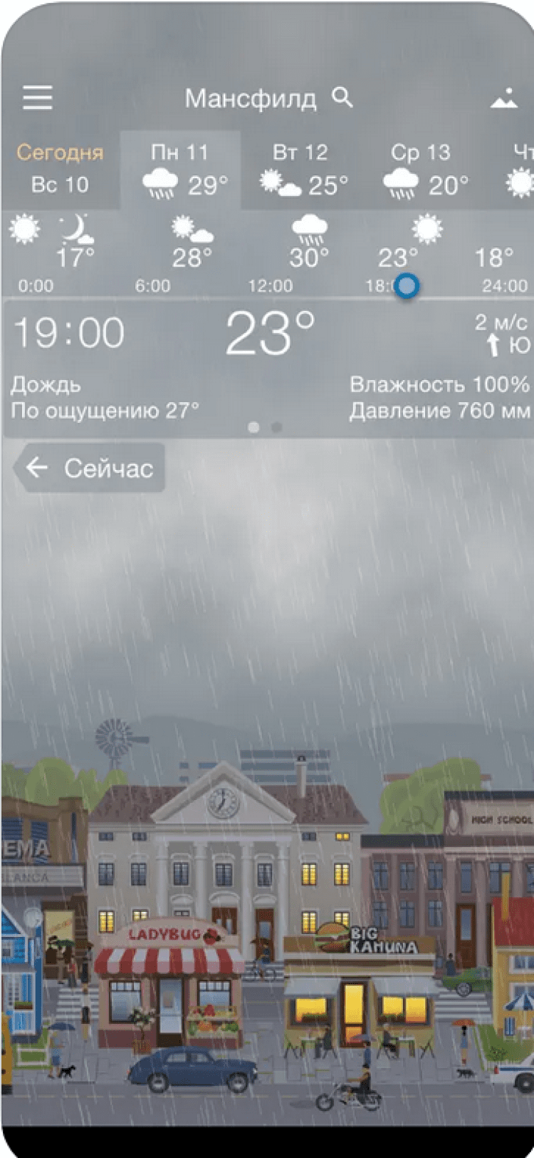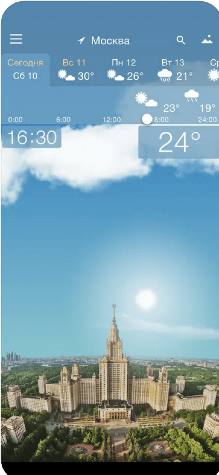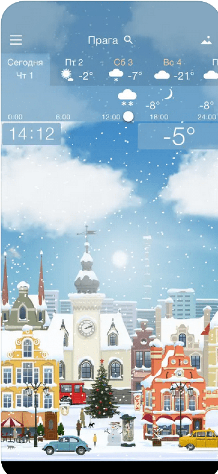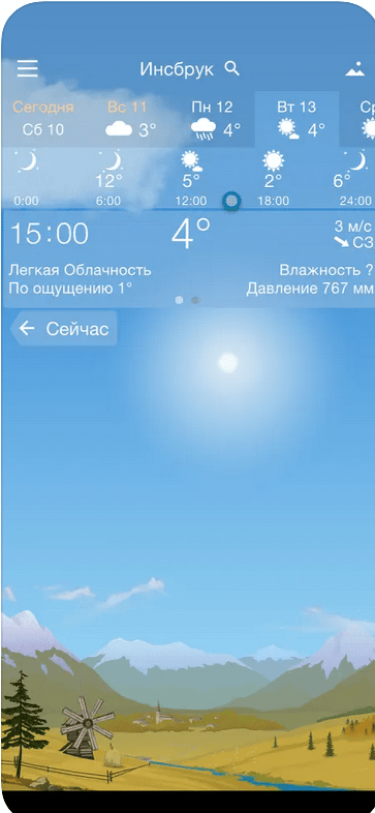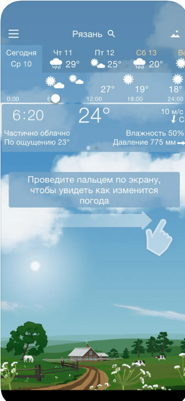 Погода YoWindow — эта программа отображает прогноз погоды в вашем городе или в мире при помощи анимированных обоев. Солнце в этой программе всходит и садится точно тогда, когда и в реальной жизни. Вы сможете увидеть, как изменится температура воздуха, направление и сила ветра в течение дня, просто проведя по экрану вашего устройства пальцем. Программа обладает красивыми живыми обоями, изображение на которых изменяется в зависимости от погоды за окном, приятными звуковыми эффектами, а так же отображает информацию о температуре воздуха в панели уведомлений. Данные о погоде берутся из источников yr.no и NWS.