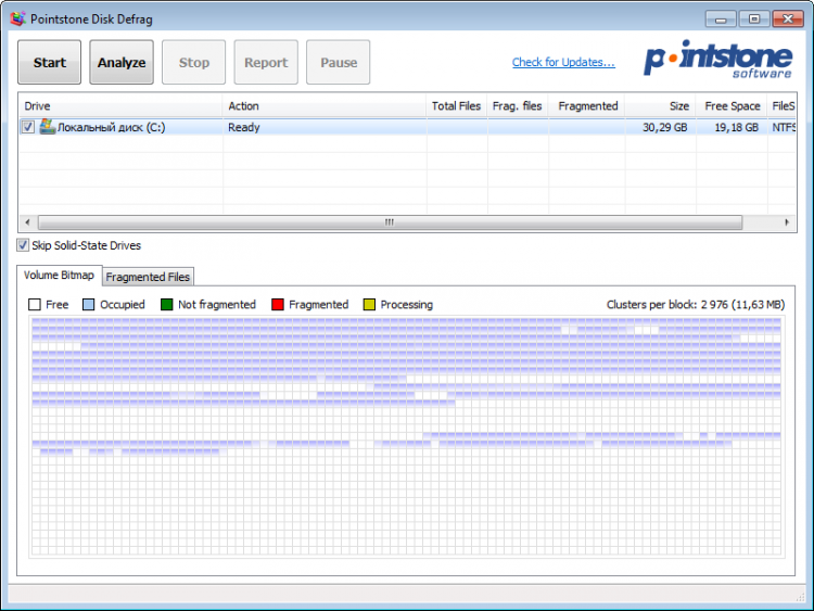 Pointstone Disk Defrag Free сперва проводит анализ выбранного жесткого диска, чтобы оценить степень фрагментации файлов на нем. Для более наглядного представления результатов анализа в главном окне показывается карта диска, а так же список фрагментированных файлов. После этого, одним нажатием можно запустить процесс дефрагментации. Pointstone Disk Defrag не требует дополнительных настроек или специальных знаний от пользователя и очень проста в использовании.