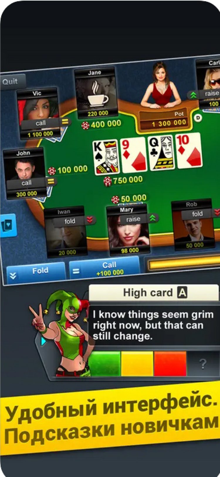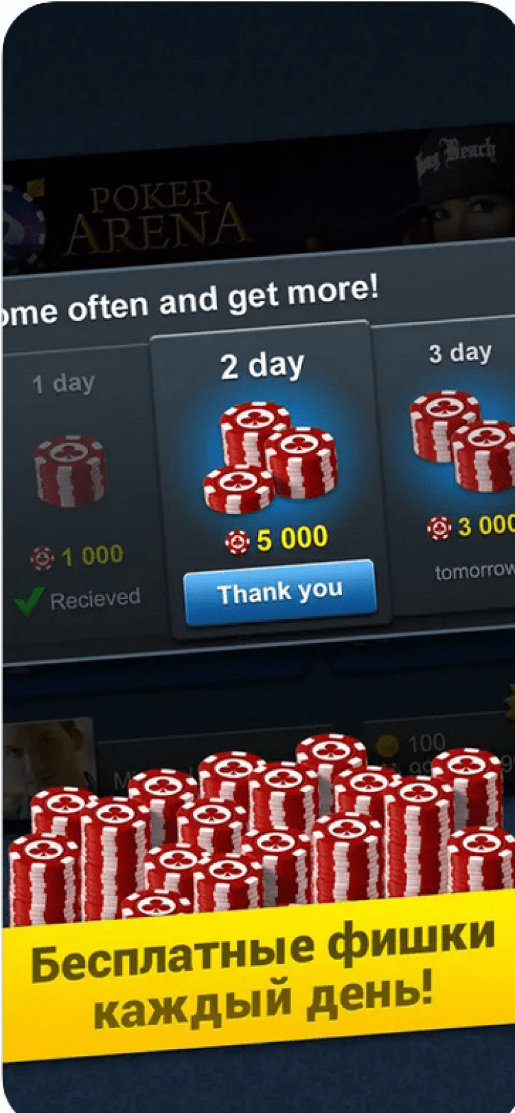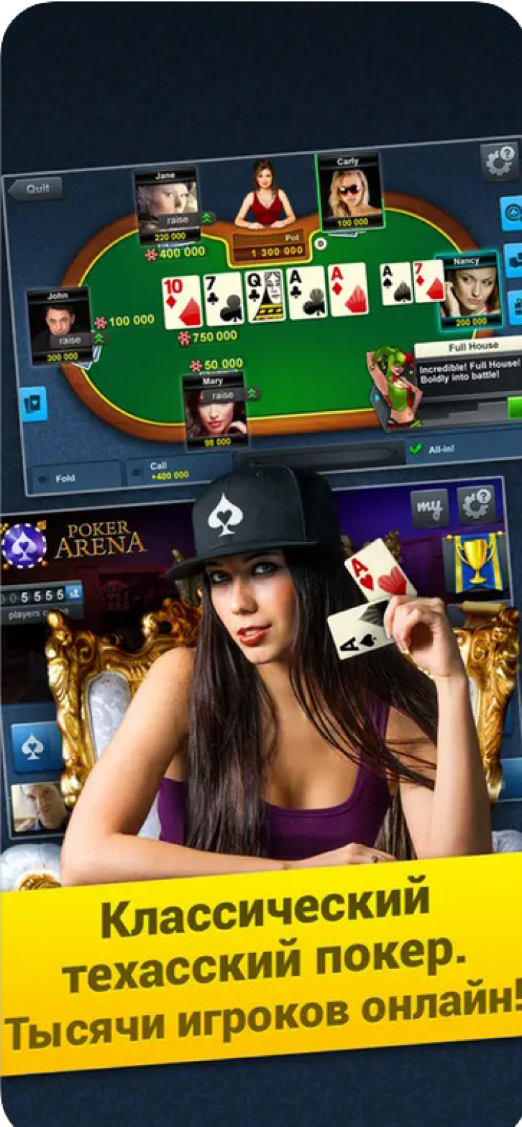 Poker Arena: онлайн покер бесплатно Программа, которая поможет вам играть бесплатно в онлайн-покер, подходящая как для опытных игроков, так и для абсолютных новичков. Poker Arena позволит вам играть как с другими игроками онлайн, так и без подключения к интернету, практикуясь и улучшая свои навыки. Во время игры вы можете пользоваться чатом для общения с другими игроками. Участвуйте в турнирах, получайте бесплатные фишки за игру каждый день, а так же многое другое.