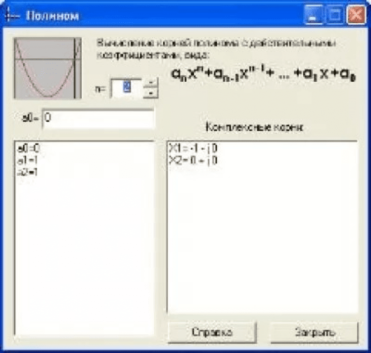 Polinom - это программа, которая позволяет находить комплексные корни полиномов (до 50 степени) с действительными коэффициентами. Решение методом приближения. Отображает график на участке корней. Подробная справка прилагается.