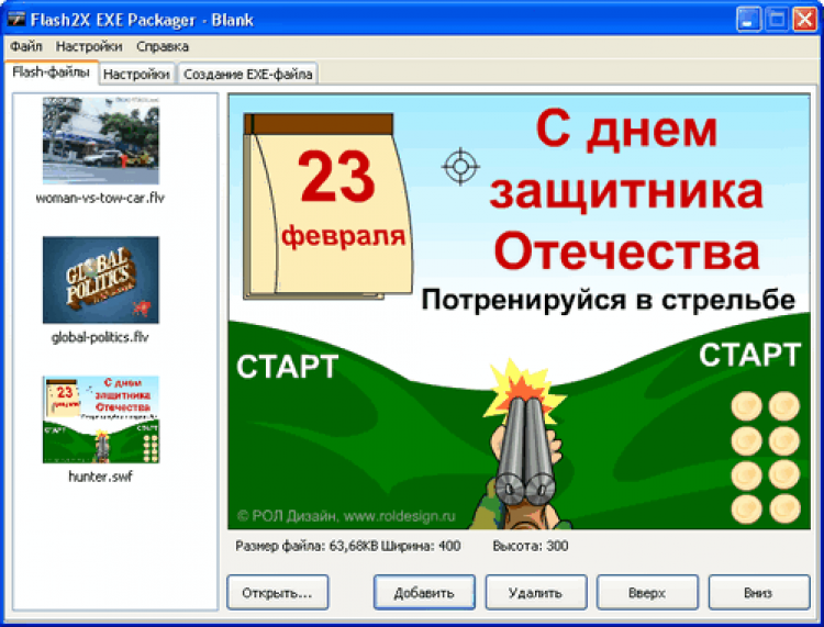 Полный русификатор Flash2X EXE Packager. Если Вы хотите просматривать скачанные Flash-анимацию, Flash-видео и любимые Flash-игры на любом компьютере и не заботиться о том, есть ли на этом компьютере Flash-плеер, то эта программа для Вас. Если Вы хотите поделиться с друзьями и знакомыми не только ссылками на видео, но и дать им возможность просмотреть их на своем компьютере, то Вы нашли то, что искали.