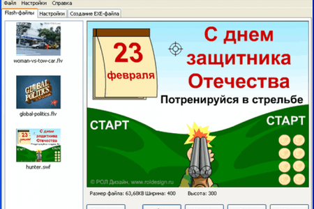 Программа создает из файлов форматов swf и flv исполняемые EXE-файлы, которые можно открыть на любом компьютере под управлением Windows. Программа имеет достаточное количество настроек, которые удовлетворят любого пользователя. Среди них: возможность ввода собственного названия, ссылки на свой веб-сайт, окно просмотра изменяемого размера и выбор его размера по умолчанию, возможность задания режима отображения контекстного меню Flash-плеера, возможность включения в файл нескольких видеороликов, запрет на извлечение FlasH из созданного EXE-файла, возможность отображения или не отображения панели плеера. Кроме того программа неплохо сжимает полученный файл и может обеспечить триал-период с вводом соответствующего регистрационного кода для разблокировки созданного EXE-файла (что может пригодится разработчикам и распространителям Flash-контента).