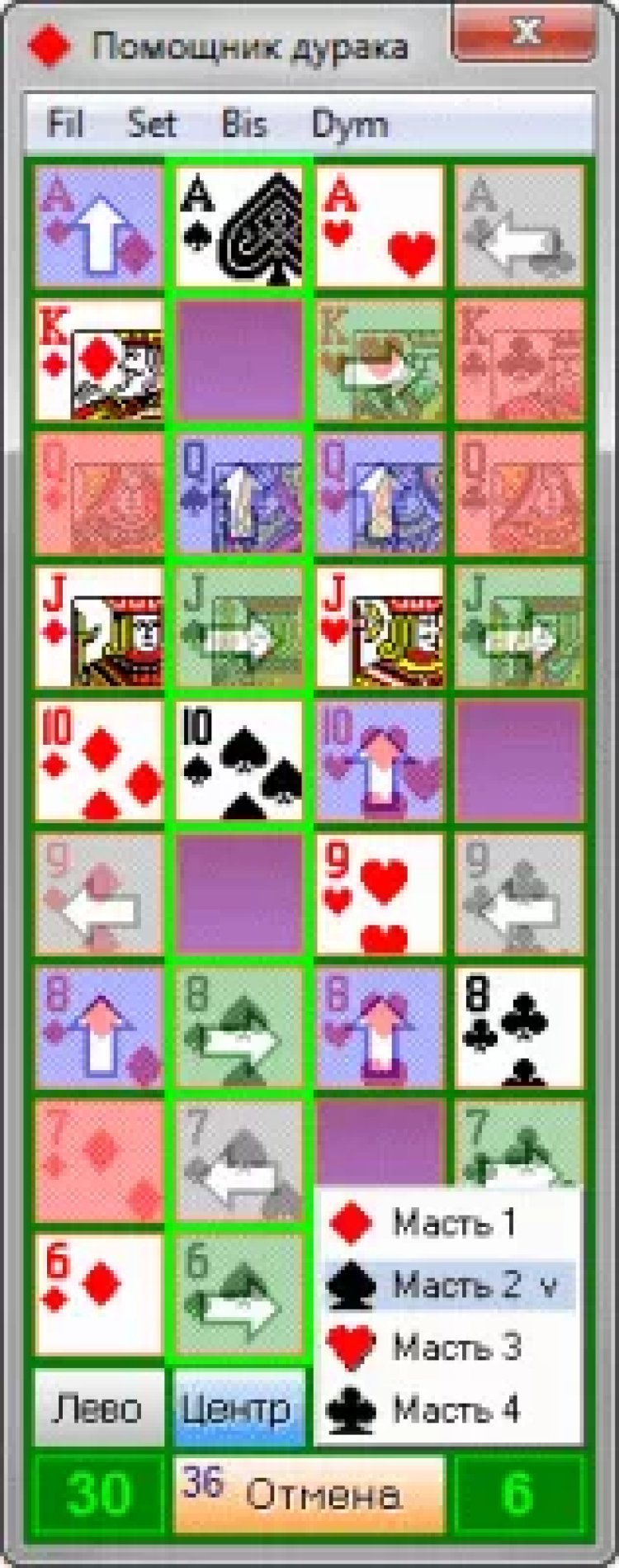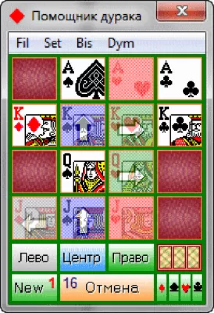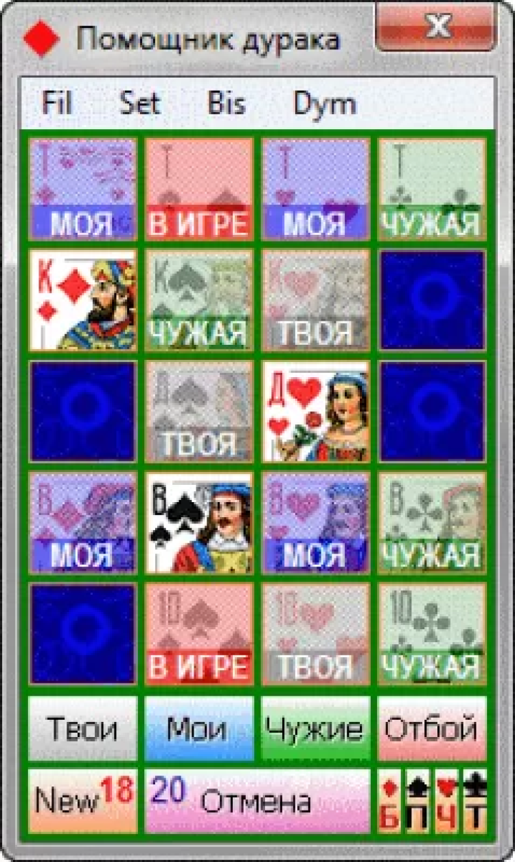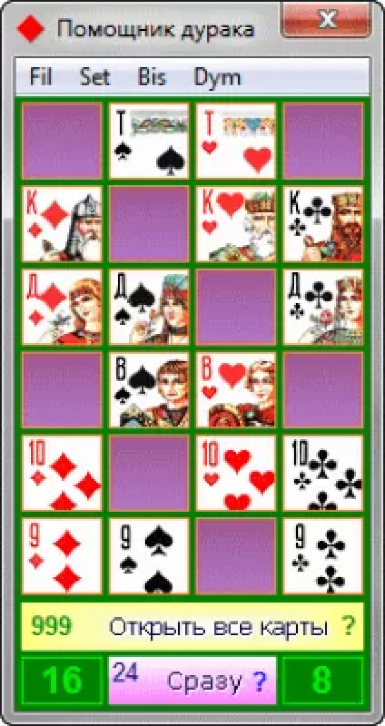 Помощник дурака - это настольная необходимость картежника. Играя в "Дурака", Вы отмечаете карты: игры, игроков (до 3) и отбоя. Хорошо всё рассчитав и сделав правильный ход в конце игры, будет очень легко обыграть противника.